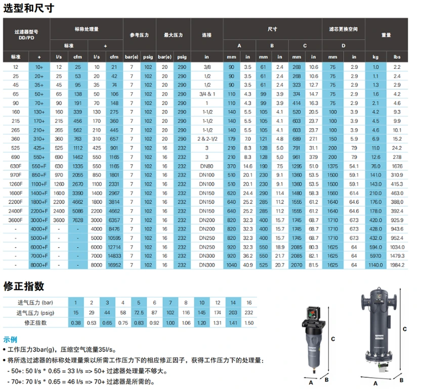 Deze tabel geeft informatie over de serie persluchtfilters en hun algemene toepassingen.