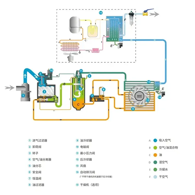 1. Opstartfase: Wanneer de aan/uit-knop wordt ingedrukt, start het elektronische regelsysteem automatisch het smeersysteem en het koelwatersysteem van de luchtcompressor. Tegelijkertijd gaat de inlaatklep open en komt er lucht in de binnenkant van de hoofdunit.