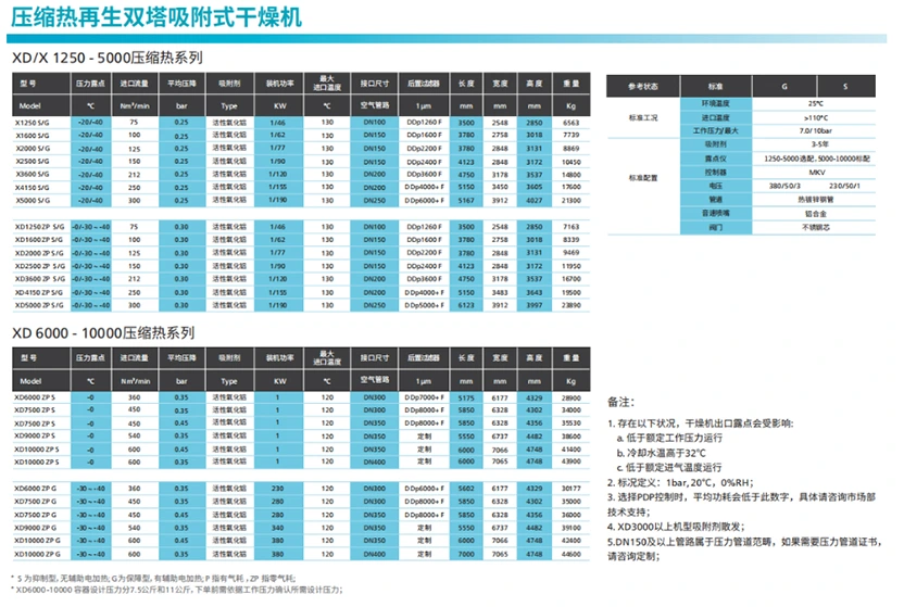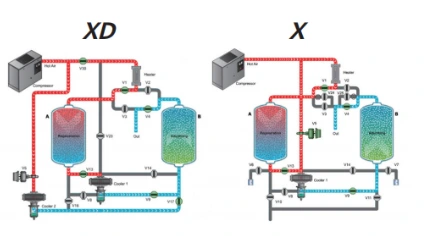 XD- of X-compressiewarmte-adsorptiedrogers maken gebruik van hoogwaardige adsorbentia en maken efficiënt gebruik van de compressiewarmte van de olievrije compressor om het adsorbens te regenereren, waardoor het energieverbruik en de onderhoudskosten aanzienlijk worden verlaagd.