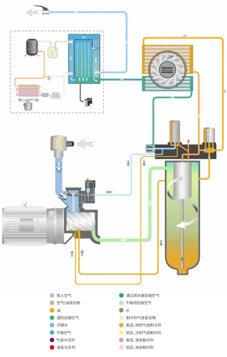 · De ingebouwde droger maakt gebruik van tegenstroomwarmtewisselaar, ingebouwde waterafscheider en kan de droger aanpassen aan de belasting van de luchtcompressor.
